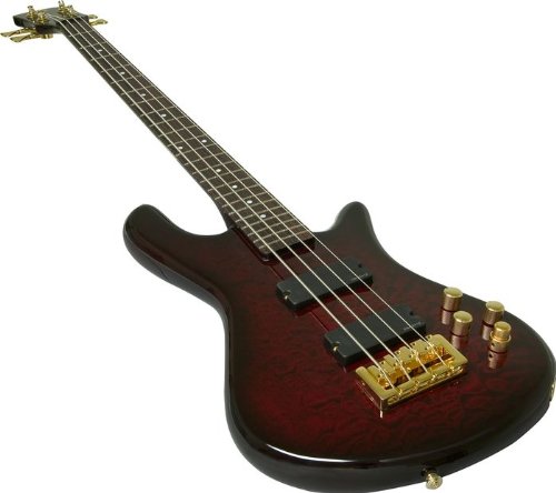 Original Spector NS curved body shape. 3 pc set-neck maple neck, 24 fret rosewood fingerboard. Black hardware, including Spector locking bridge. Genuine figured maple top, basswood body. High gloss finish. Spector SSD passive humbuckers with special EMG 3 band active tone controls.